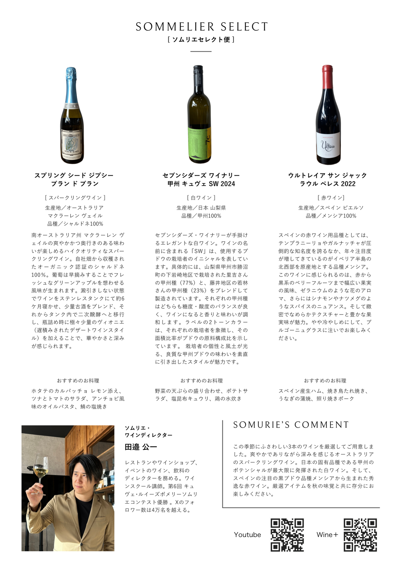 ソムリエ・ワインディレクター田邉公一氏がセレクトするスパークリング、赤ワイン、白ワインの3本セットを毎月リリースしております。定期便を単月分だけお楽しみいただけるセットご準備しました。