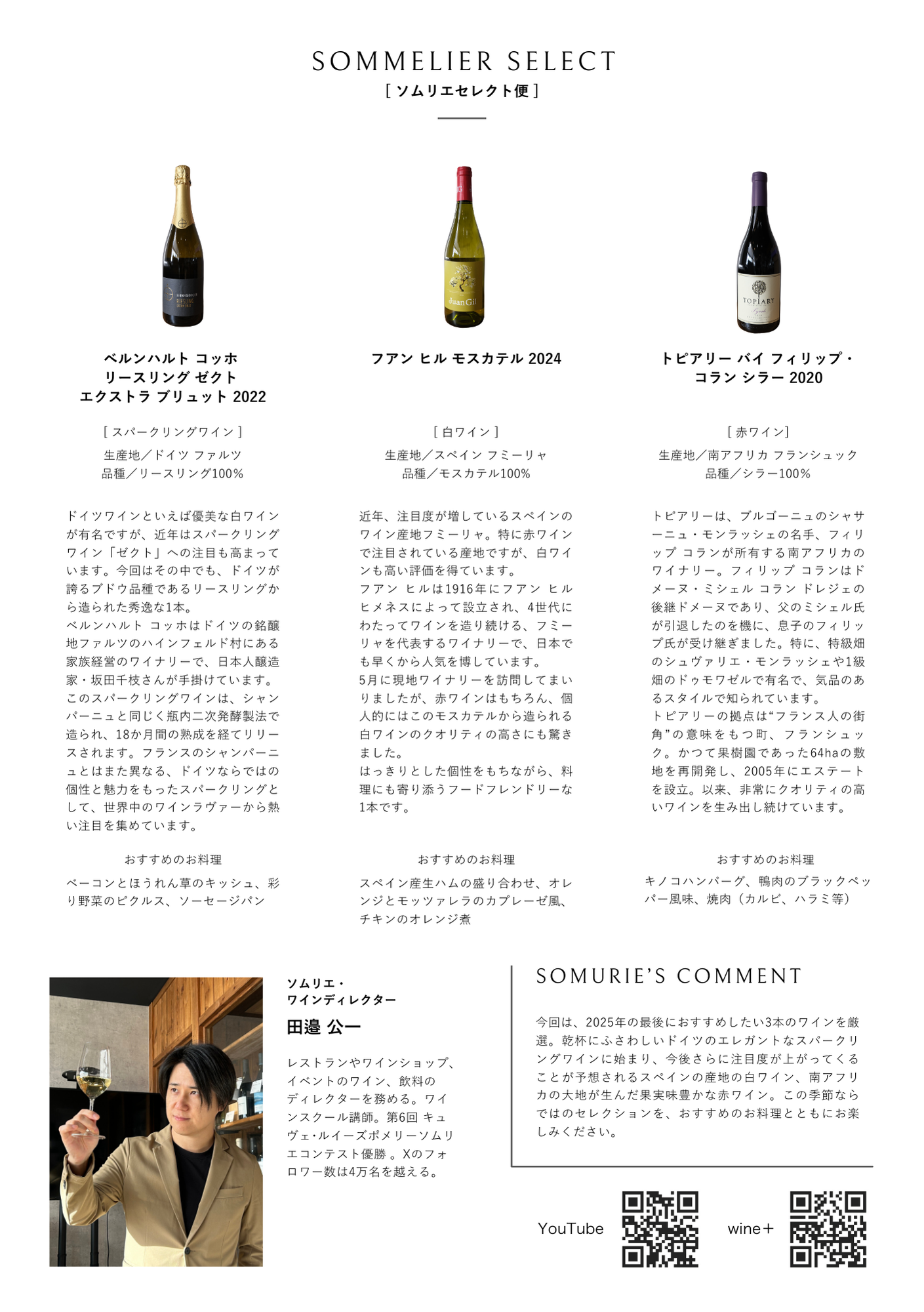 ソムリエ・ワインディレクター田邉公一氏がセレクトするスパークリング、赤ワイン、白ワインの3本セットを毎月リリースしております。定期便を単月分だけお楽しみいただけるセットご準備しました。